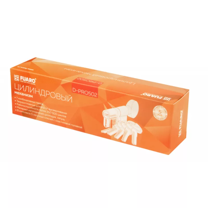 Цилиндровый механизм Fuaro D-PRO502 предназначен для установки в корпуса врезных цилиндровых замков для всех типов дверей. Вариант исполнения: ключ-вертушка. Тип ключа: "перфорированный". Материал изготовления цилиндра: латунь. Количество пинов: 7. Секретность более 78 000 комбинаций. Твердосплавные штифты от высверливания. Защита от отмычек. Работоспособность более 250 000 циклов. Комплектация: 5 латунных ключей с пластиковой головкой, крепежный винт 70 мм. Гарантия: 5 лет.