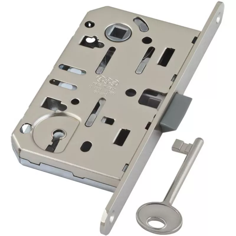 Замок врезной бесшумный B01101.50.34 под ключ серии MEDIANA EVOLUTION предназначен для установки в межкомнатные двери. Подходит для левых и правых дверей. Более тихий замок благодаря новой конструкции и новым внутренним компонентам. Бесшумная пластиковая защелка с двойным наклоном может фиксироваться ключом внутри замка (при перевозке деревянного полотна). Новая защищенная патентом система поворота защелки. Цвет: матовый хром.