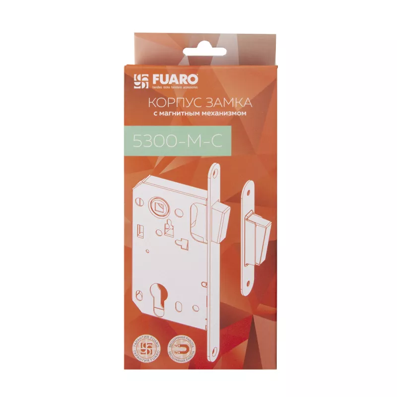 Бесшумный магнитный корпус замка Fuaro 5300-M-C изготовлен в соответствии с требованиями ГОСТ 5089-2011. Предназначен для установки в деревянные межкомнатные и сантехнические двери с комплектованием цилиндром, подходит для дверей левого и правого открывания. Корпус выполнен из стали с надежным гальваническим покрытием. Магнитный механизм обеспечивает бесшумность работы замка. Защелка 5300-M-C c усиленным блоком пружин имеет высший 4 класс надежности (250 000 циклов открывания/закрывания). Отверстия под стяжные винты находятся на расстоянии 38 мм. Возможна установка дверных ручек на стяжные винты для более прочного крепления. В комплектацию входят: ответная планка с магнитной вставкой и крепежная фурнитура в цвет изделия.