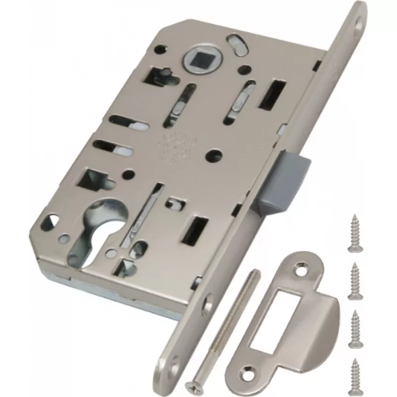 B01103.50.34.567 Замок межкомнатный под цилиндр в комплекте с ответной планкой. Блистерная упаковка. Цвет матовый хром. Защелка MEDIANA EVOLUTION с пластиковым язычком отличается бесшумностью при закрывании. Она разработанна инженерами компании AGB и объединяет в себе надежность, качество используемых материалов, точность механических соединений и инновации. Все замки серии Evolution имеют один размер и взаимозаменяемы между собой.