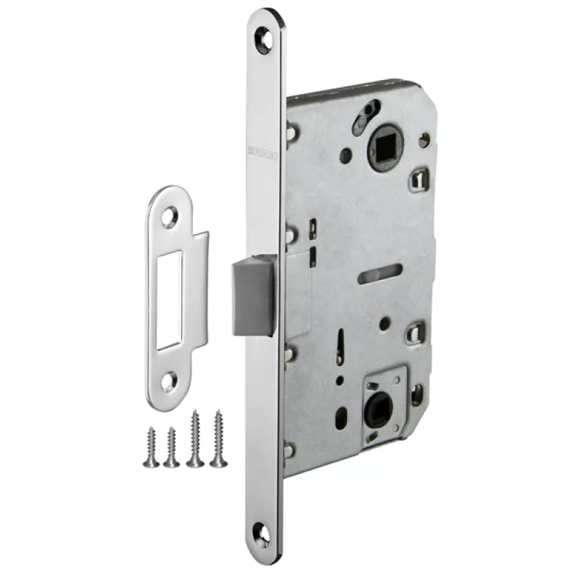 Дверная защелка с пластиковым механизмом Fuaro P96WC серии PLASTIC изготовлена в соответствии с требованиями ГОСТ 5089-2003. Предназначена для установки в деревянные межкомнатные и сантехнические двери. Легкая смена направления язычка защелки, подходит для дверей левого и правого открывания. Корпус выполнен из стали с надежным гальваническим покрытием. Ударопрочный пластиковый механизм обеспечивает бесшумность работы защелки. Защелка P96WC с усиленным блоком пружин имеет высший 4 класс надежности (250 000 циклов открывания/закрывания). Отверстия под стяжные винты находятся на расстоянии 38 мм. Размер бэксета - 50 мм. Размер межосевого расстояния - 96 мм. Возможна установка дверных ручек на стяжные винты для более прочного крепления. Цвет: хром. В комплектацию входят: ответная планка и крепежная фурнитура в цвет изделия.