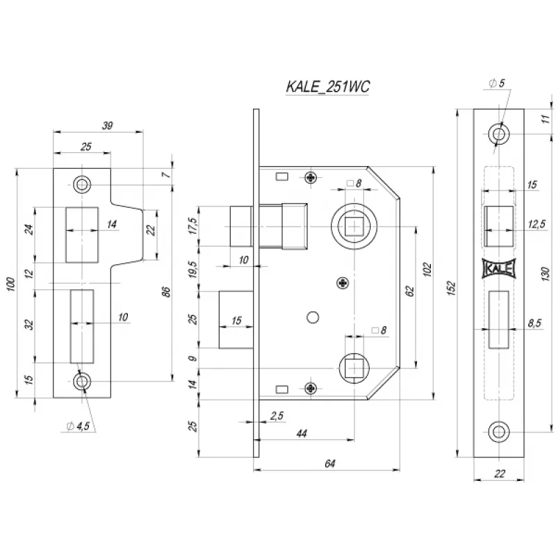 Защелка Kale kilit (Кале килит) врезная 251 WC (44 mm) (латунь), прав.
