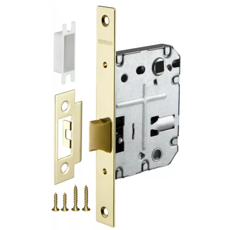 Дверная защелка с пластиковым механизмом Fuaro P72 серии PLASTIC изготовлена в соответствии с требованиями ГОСТ 5089-2003. Предназначена для установки в деревянные межкомнатные двери. Легкая смена направления язычка защелки, подходит для дверей левого и правого открывания. Корпус выполнен из стали с надежным гальваническим покрытием. Ударопрочный пластиковый механизм обеспечивает бесшумность работы защелки. Защелка P72 с усиленным блоком пружин имеет высший 4 класс надежности (250 000 циклов открывания/закрывания). Отверстия под стяжные винты находятся на расстоянии 35-41 мм. Размер бэксета - 50 мм. Размер межосевого расстояния - 70 мм. Возможна установка дверных ручек на стяжные винты для более прочного крепления. Цвет: золото. В комплектацию входят: ответная планка с декоративной вставкой и крепежная фурнитура в цвет изделия.
