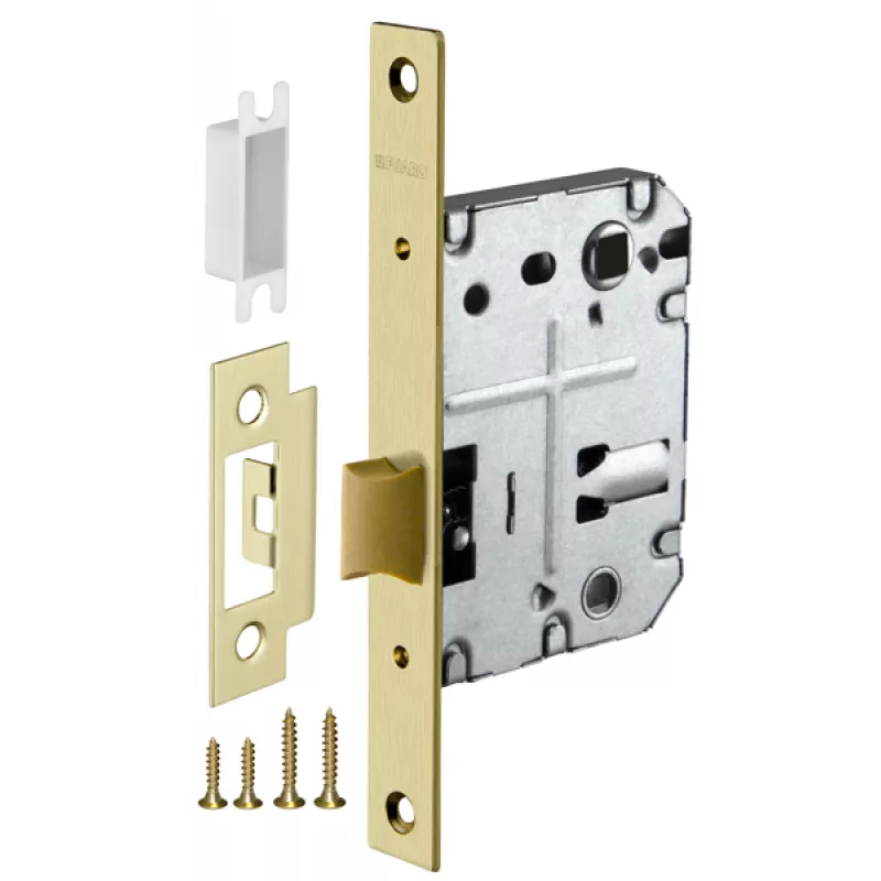 Дверная защелка с пластиковым механизмом Fuaro P72 серии PLASTIC изготовлена в соответствии с требованиями ГОСТ 5089-2003. Предназначена для установки в деревянные межкомнатные двери. Легкая смена направления язычка защелки, подходит для дверей левого и правого открывания. Корпус выполнен из стали с надежным гальваническим покрытием. Ударопрочный пластиковый механизм обеспечивает бесшумность работы защелки. Защелка P72 с усиленным блоком пружин имеет высший 4 класс надежности (250 000 циклов открывания/закрывания). Отверстия под стяжные винты находятся на расстоянии 35-41 мм. Размер бэксета - 50 мм. Размер межосевого расстояния - 70 мм. Возможна установка дверных ручек на стяжные винты для более прочного крепления. Цвет: матовое золото. В комплектацию входят: ответная планка с декоративной вставкой и крепежная фурнитура в цвет изделия.