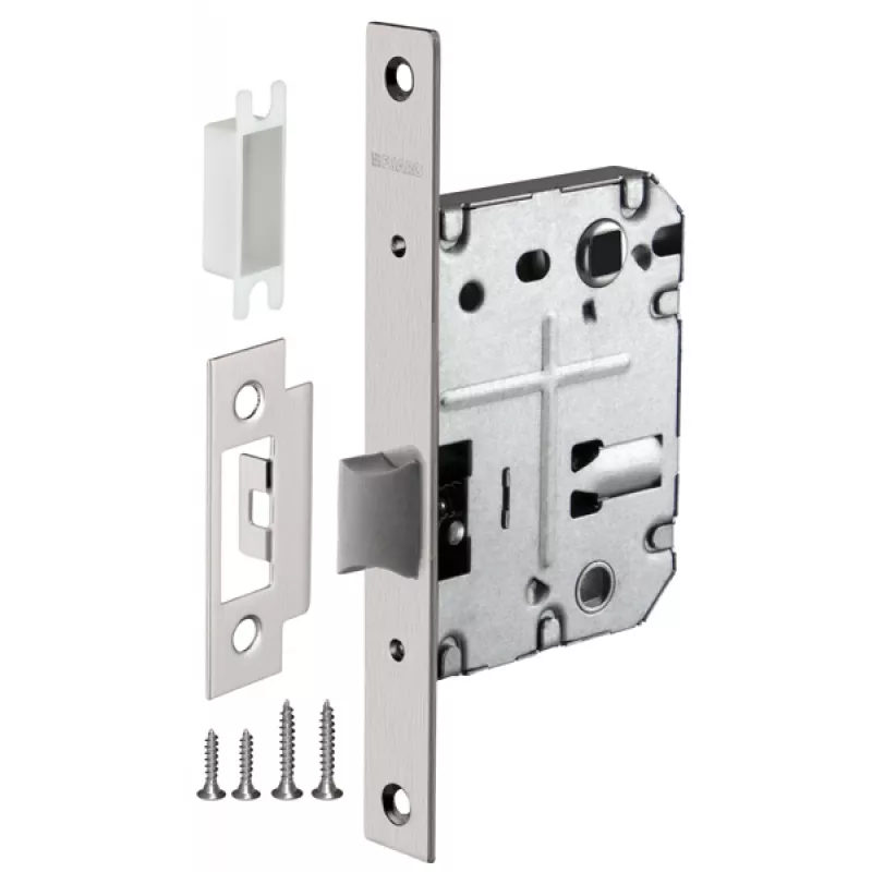 Дверная защелка с пластиковым механизмом Fuaro P72 серии PLASTIC изготовлена в соответствии с требованиями ГОСТ 5089-2003. Предназначена для установки в деревянные межкомнатные двери. Легкая смена направления язычка защелки, подходит для дверей левого и правого открывания. Корпус выполнен из стали с надежным гальваническим покрытием. Ударопрочный пластиковый механизм обеспечивает бесшумность работы защелки. Защелка P72 с усиленным блоком пружин имеет высший 4 класс надежности (250 000 циклов открывания/закрывания). Отверстия под стяжные винты находятся на расстоянии 35-41 мм. Размер бэксета - 50 мм. Размер межосевого расстояния - 70 мм. Возможна установка дверных ручек на стяжные винты для более прочного крепления. Цвет: матовый никель. В комплектацию входят: ответная планка с декоративной вставкой и крепежная фурнитура в цвет изделия.