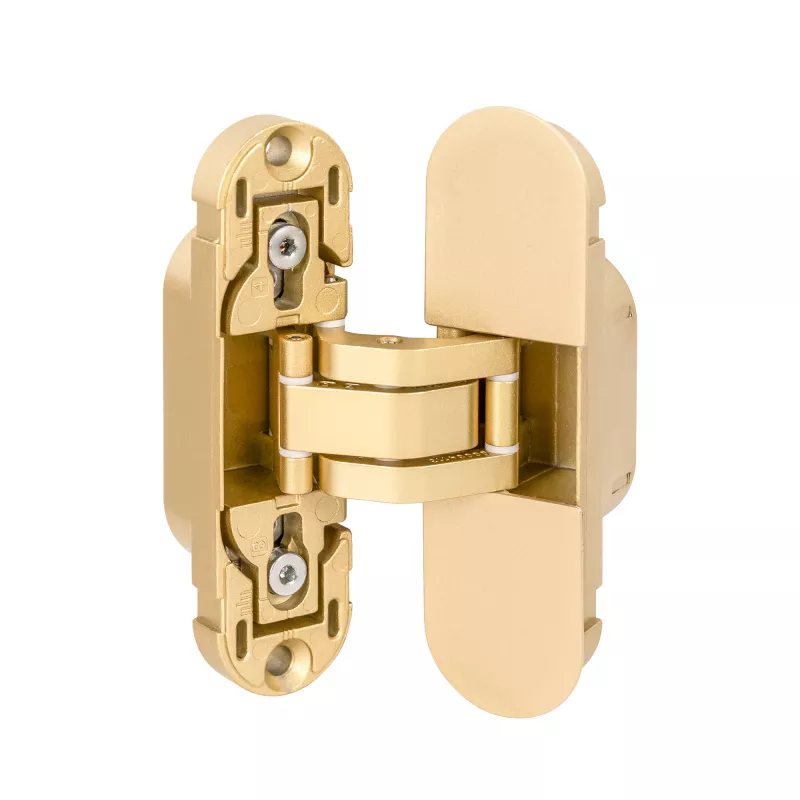 Eclipse 2.2 - универсальная петля скрытой установки для левых и правых дверей, с уменьшенной толщиной до 21 мм в коробку. Регулируется в трёх плоскостях: по горизонтали ±1,5 мм, высоте ±2 мм и притвору ±1 мм. Нагрузка до 60 кг на две петли, до 80 кг на три петли. Петля открывается на 180° и может использоваться с доводчиком. Декоративные накладки в комплекте. Материал: ЦАМ. Цвет: матовая латунь.