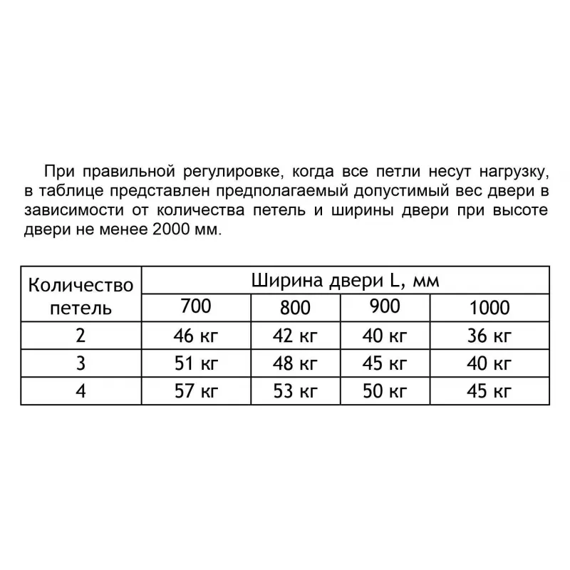 42 кг допустимая нагрузка на 2 петли дверью шириной 800 мм и высотой не менее 2000 мм при правильной регулировке (другие значения представлены в таблице)