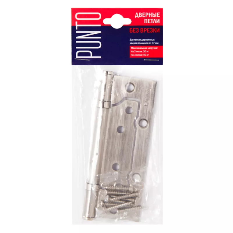 Универсальная дверная петля без врезки Punto 200-2B/HD изготовлена из стали, подходит для дверей левого и правого открывания. Гальваническое покрытие прошло тест на устойчивость к коррозии в соляном тумане и соответствует 1 классу ГОСТ. В петле установлены втулка-подшипники и стальной стержень, что обеспечивает работоспособность 200 000 циклов открывания/закрывания. Максимальная нагрузка на 2 петли 35 кг, на 3 петли 45 кг. Размер петли: 125x2,5. Цвет: хром. Саморезы в цвет изделия в комплекте. Упаковка: подвес (пакет с картонкой).