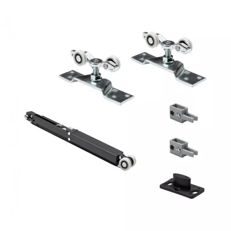Комплект фурнитуры для одной раздвижной двери. максимальная нагрузка на полотно до 50 кг минимальная толщина дверного полотна 28 мм, в комплект входит верхняя направляющая AF-95 - 2 метра и нижняя направляющая на 1 полотно + 1 доводчик для плавного закрывания или открывания двери.