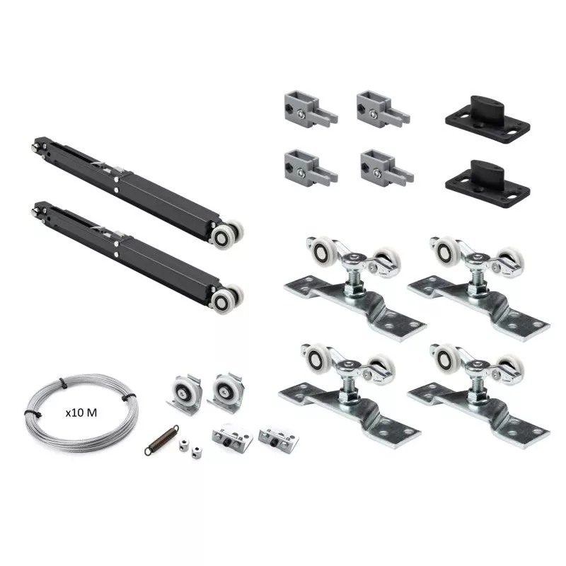 Комплект фурнитуры для двух синхронных дверей, максимальная нагрузка на полотно 50 кг, минимальная толщина дверного полотна 30 мм, минимальная ширина дверного полотна 465 мм, + 2 доводчика для плавного закрывания или открывания двери, в комплект входит направляющая AF-95 на 3 метра.