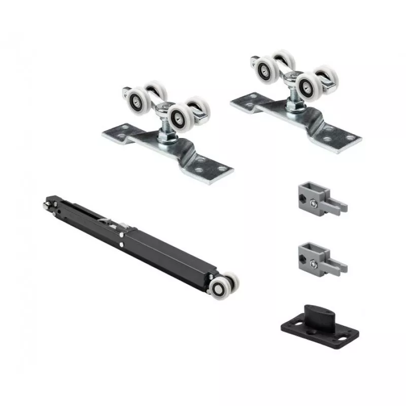 Комплект фурнитуры для одной раздвижной двери. максимальная нагрузка на полотно до 80 кг минимальная толщина дверного полотна 28 мм, в комплект входит верхняя направляющая AF-95 - 2 метра и нижняя направляющая на 1 полотно + 1 доводчик для плавного закрывания или открывания двери.