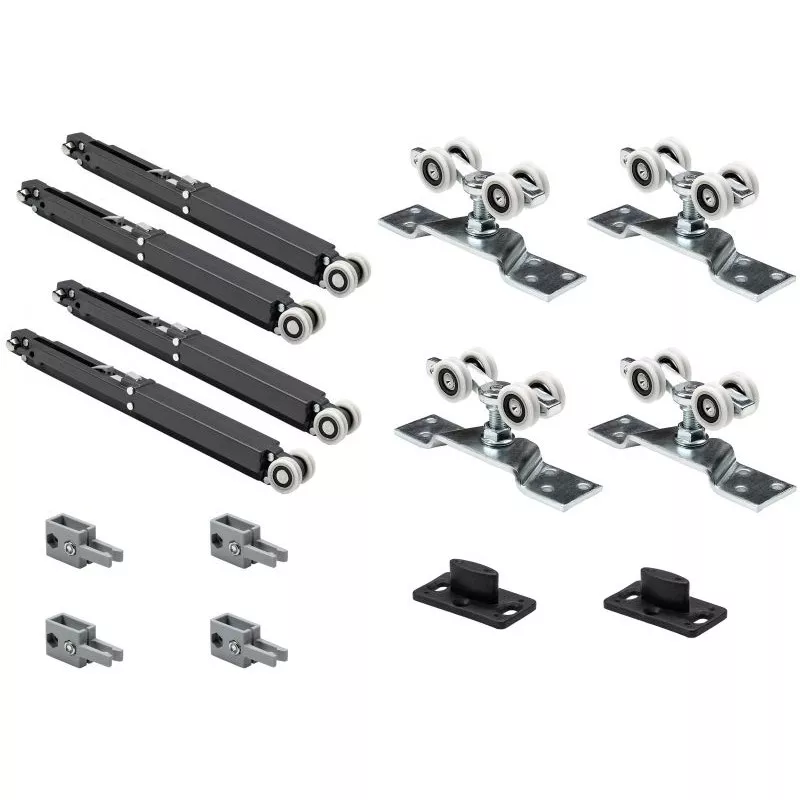 Комплект фурнитуры для двухстворчатых раздвижных дверей. максимальная нагрузка на полотно до 80 кг минимальная толщина дверного полотна 28 мм, в комплект входит верхняя направляющая AF-95 - 3 метра и нижняя направляющая на 2 полотна + 4 доводчика для плавного закрывания и открывания двери.