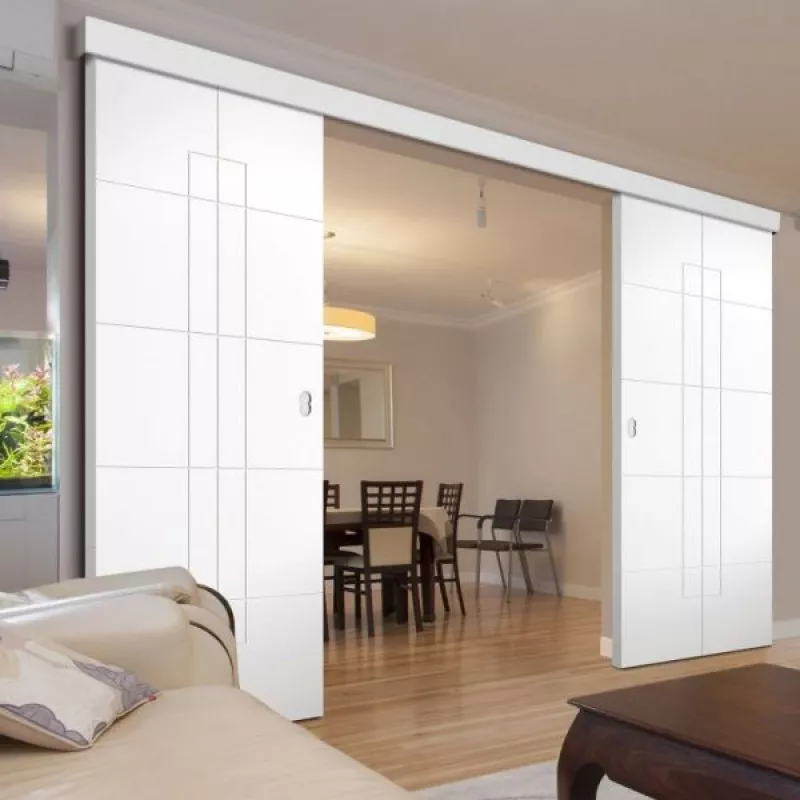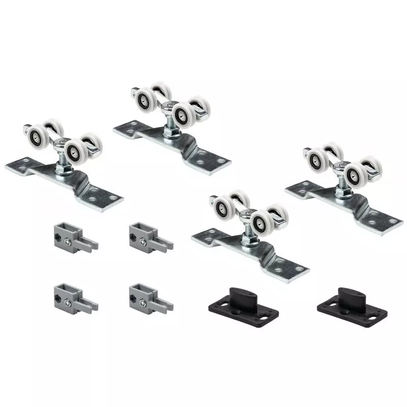 Комплект фурнитуры для двухстворчатых раздвижных дверей, максимальная нагрузка на полотно до 80 кг, минимальная толщина дверного полотна 28 мм, в комплект входит верхняя направляющая AF-95 - 3 метра и нижняя направляющая на 2 полотна