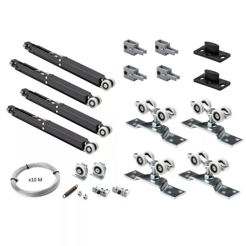 Комплект фурнитуры для двух синхронных дверей, максимальная нагрузка на полотно 50 кг, минимальная толщина дверного полотна 30 мм, минимальная ширина дверного полотна 680 мм, + 4 доводчика для плавного закрывания и открывания двери, в комплект входит направляющая AF-95 на 3 метра.