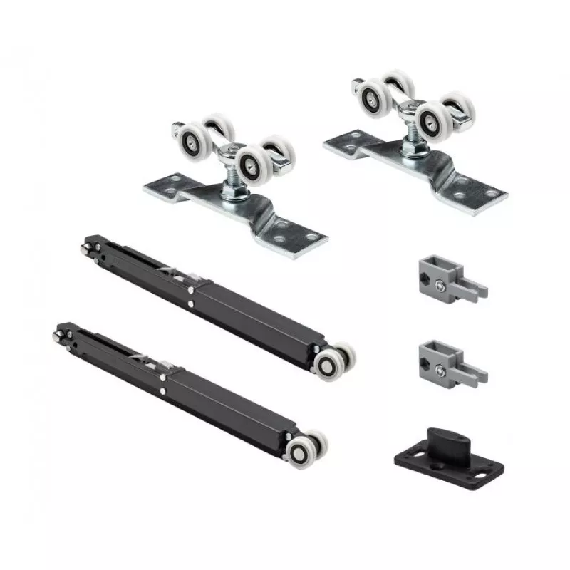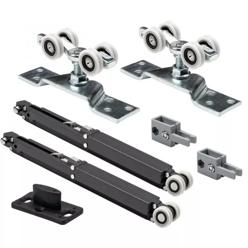 Комплект фурнитуры для одной раздвижной двери. максимальная нагрузка на полотно до 120 кг минимальная толщина дверного полотна 28 мм, в комплект входит верхняя направляющая AF-96 - 2 метра и нижняя направляющая на 1 полотно + 2 доводчика для плавного закрывания и открывания двери.