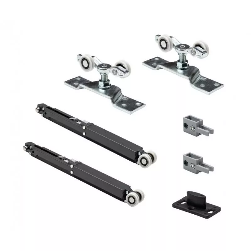 Комплект фурнитуры для одной раздвижной двери. максимальная нагрузка на полотно до 50 кг минимальная толщина дверного полотна 28 мм, в комплект входит верхняя направляющая AF-95 - 2 метра и нижняя направляющая на 1 полотно + 2 доводчика для плавного закрывания и открывания двери.