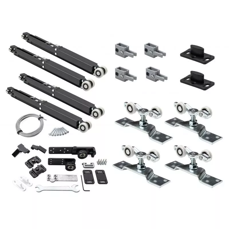 Комплект фурнитуры для телескопических дверей, комплект предназначен на 2 полотна + одна панель фиксированная, комплект в себя включает 3 комплекта роликов и фурнитуру для телескопического привода для 2-х полотен, три направляющих профиля AF-95 - 3 метра. Максимальный вес одного полотна до 50 кг, ширина полотна от 680 мм до 1200 мм, толщина полотна от 30 мм. + 4 доводчика для плавного открывания и закрывания двери.