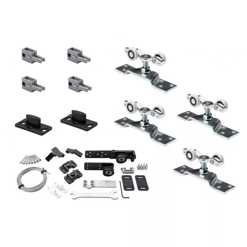 Комплект фурнитуры для телескопических дверей, комплект предназначен на 2 полотна + одна панель фиксированная, комплект в себя включает 3 комплекта роликов и фурнитуру для телескопического привода для 2-х полотен, три направляющих профиля AF-95 - 3 метра. Максимальный вес одного полотна до 50 кг, ширина полотна от 500 мм до 1200 мм, толщина полотна от 30 мм.
