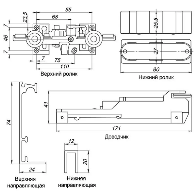 Скрытая раздвижная система для дверей весом до 40 кг, ширинаполотна до 1150 мм. Толщина полотна от 30 до 40 мм. В комплектвходит алюминиевая направляющая + 2 доводчика плавногозакрывания/открывания двери.