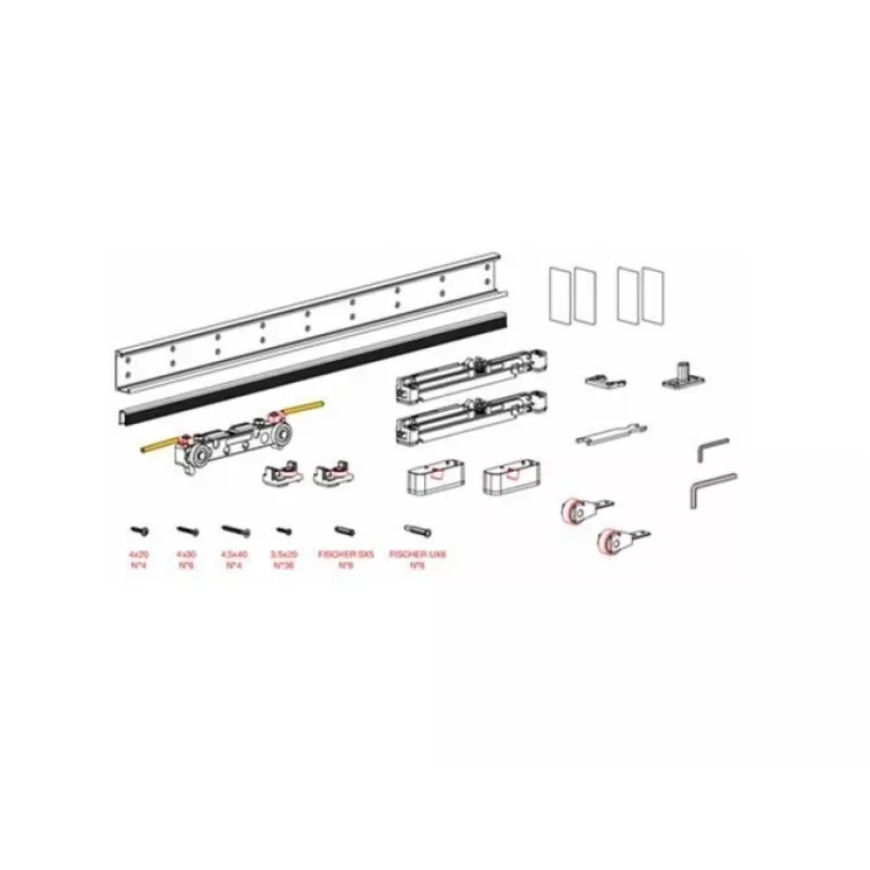 В комплект входит: - верхний направляющий профиль 1095 мм. - ролик - доводчики - нижний направляющий профиль 950 мм. - колеса - крепеж Дверные полотна в комплект НЕ ВХОДЯТ