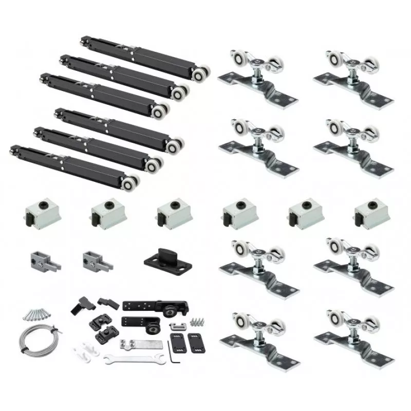 Комплект фурнитуры для телескопических дверей, комплект предназначен на 3 полотна + одна панель фиксированная, комплект в себя включает 4 комплекта роликов и фурнитуру для телескопического привода для 3-х полотен, 4 направляющих профиля AF-95 - 4 метра. Максимальный вес одного полотна до 50 кг, ширина полотна от 680 мм до 1200 мм, толщина полотна от 30 мм. + 6 доводчиков для плавного открывания и закрывания двери.