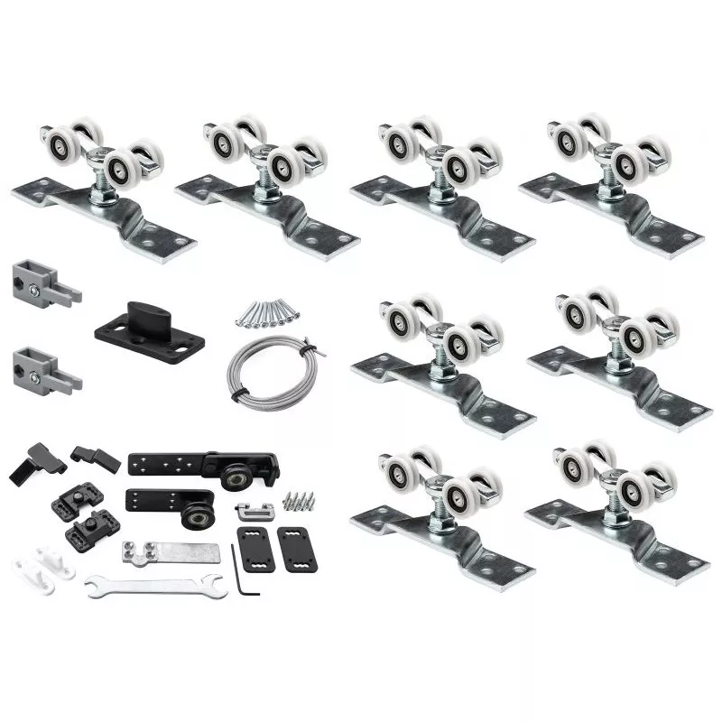 Комплект фурнитуры для телескопических дверей, комплект предназначен на 3 полотна + одна панель фиксированная, комплект в себя включает 4 комплекта роликов и фурнитуру для телескопического привода для 3-х полотен, 4 направляющих профиля AF-95 - 4 метра. Максимальный вес одного полотна до 80 кг, ширина полотна от 500 мм до 1200 мм, толщина полотна от 30 мм.