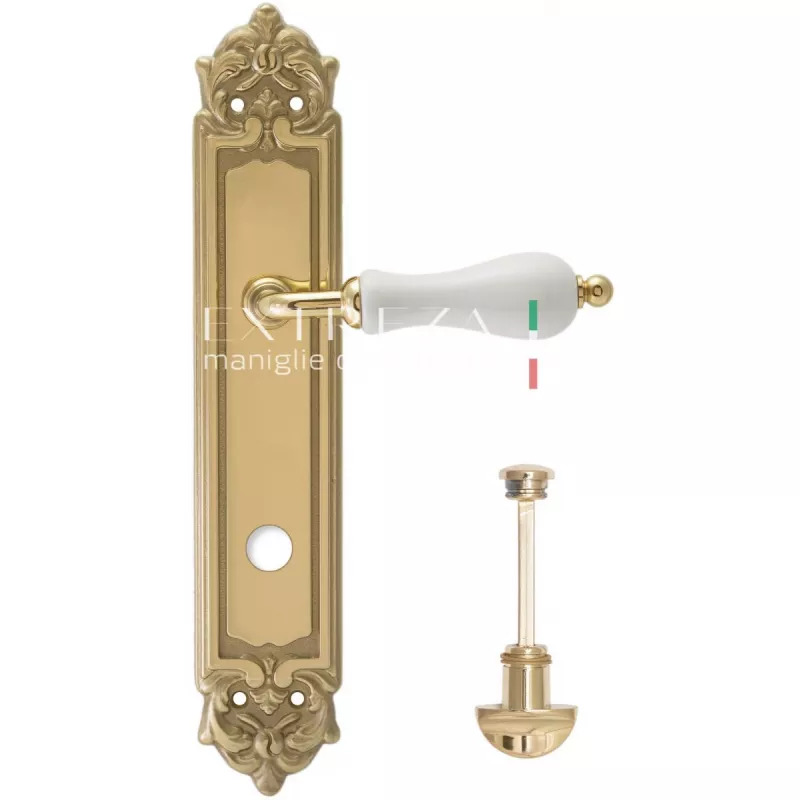 модель Дверная ручка Extreza "DANA" (Дана) 305 на планке PL02 WC полированная латунь F01 производителя Extreza удачно сочетает в себе изящество и, элегантный внешний вид. Модель окрашена в необычный оттенок – Полированное золото, однако не только это делает ее эксклюзивной. Дизайнерам удалось найти компромисс между достаточно простым исполнением ручки и аристократичным внешним видом. При весомых эстетичных достоинствах элемент фурнитуры демонстрирует еще и отличные прочностные характеристики. Данная фурнитура рассчитана на интенсивную эксплуатацию.