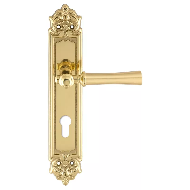 модель Дверная ручка Extreza "DEZI" (Дези) 309 на планке PL02 CYL полированная латунь F01 производителя Extreza удачно сочетает в себе изящество и, элегантный внешний вид. Модель окрашена в необычный оттенок – Полированное золото, однако не только это делает ее эксклюзивной. Дизайнерам удалось найти компромисс между достаточно простым исполнением ручки и аристократичным внешним видом. При весомых эстетичных достоинствах элемент фурнитуры демонстрирует еще и отличные прочностные характеристики. Данная фурнитура рассчитана на интенсивную эксплуатацию.