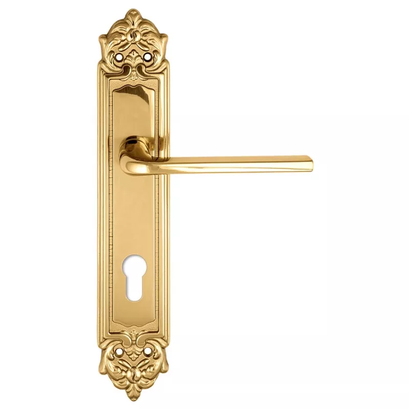 модель Дверная ручка Extreza "TERNI" (Терни) 320 на планке PL02 CYL полированная латунь F01 производителя Extreza удачно сочетает в себе изящество и, элегантный внешний вид. Модель окрашена в необычный оттенок – Полированное золото, однако не только это делает ее эксклюзивной. Дизайнерам удалось найти компромисс между достаточно простым исполнением ручки и аристократичным внешним видом. При весомых эстетичных достоинствах элемент фурнитуры демонстрирует еще и отличные прочностные характеристики. Данная фурнитура рассчитана на интенсивную эксплуатацию.