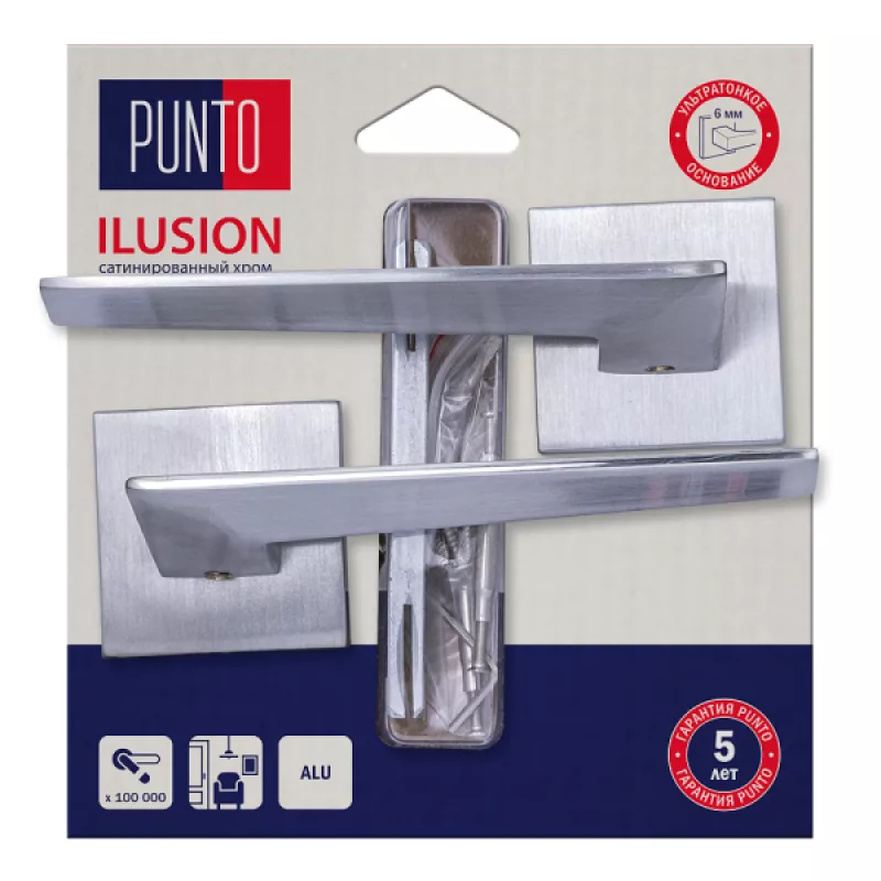 Дверные ручки Punto ILUSION серии QS из коллекции SIMPLE LIVING предназначены для установки в межкомнатные и внутренние входные двери. Гальваническое покрытие прошло тест на устойчивость к коррозии в соляном тумане и соответствует 1 классу ГОСТ. Ресурс работы дверных ручек более 150 000 циклов открывания/закрывания. Материал - алюминий. Комплектация: комплект крепежной фурнитуры, соединительный квадрат 8x105 мм.