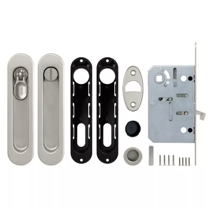 Набор для раздвижных дверей SH011-BK SN-3 Матовый никель коллекции LEGEND COLLECTION предназначен для установки на межкомнатные раздвижные двери и шкафы-купе. Идеально сочетается с фурнитурой Armadillo в аналогичных цветах. В комплект входит: ручки для раздвижных дверей, пластиковый вкладыш, торцевой захват, защелка для раздвижных дверей, ответная планка, крепежный комплект, шаблон для монтажа.