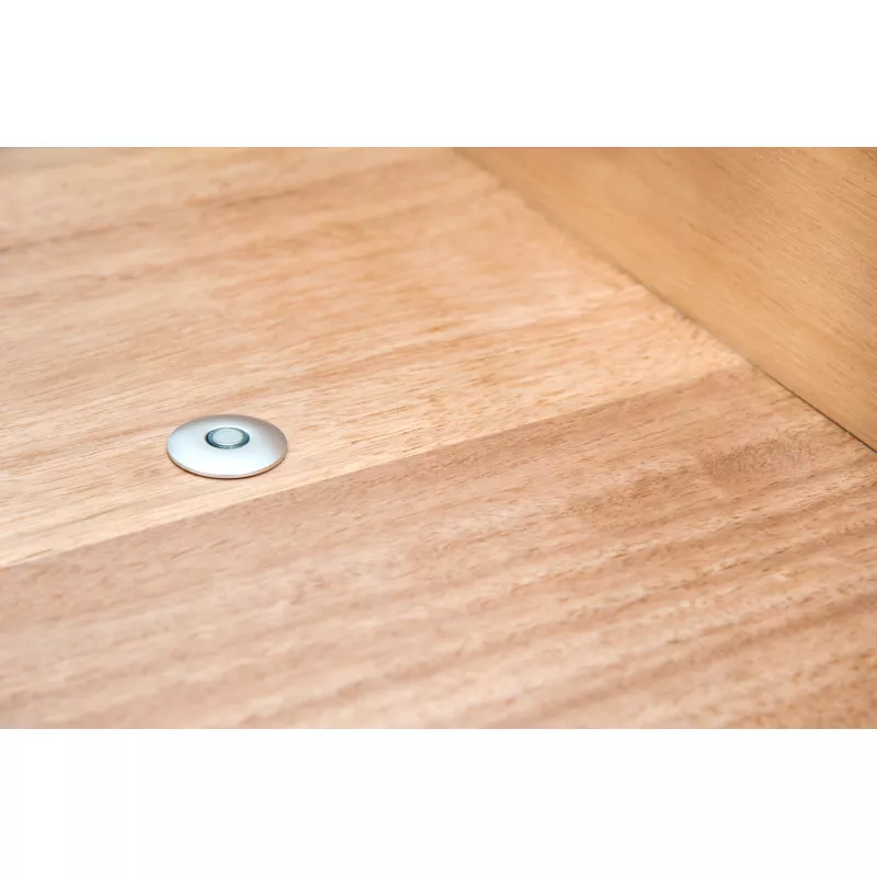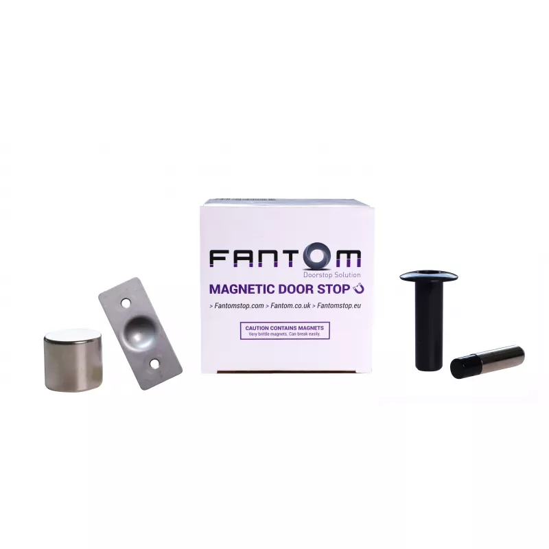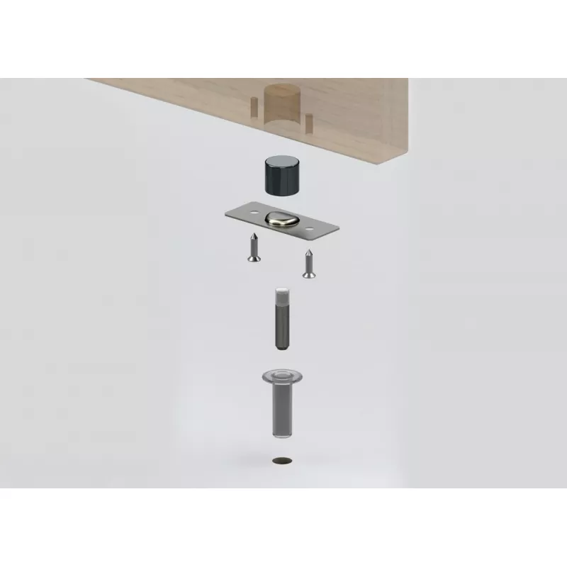Стопор состоит из редкоземельного неодимового магнита, втулки из полимера или металла, металлического штифта с полимерным наконечником и пластины, которая фиксирует магнит в дверном полотне.