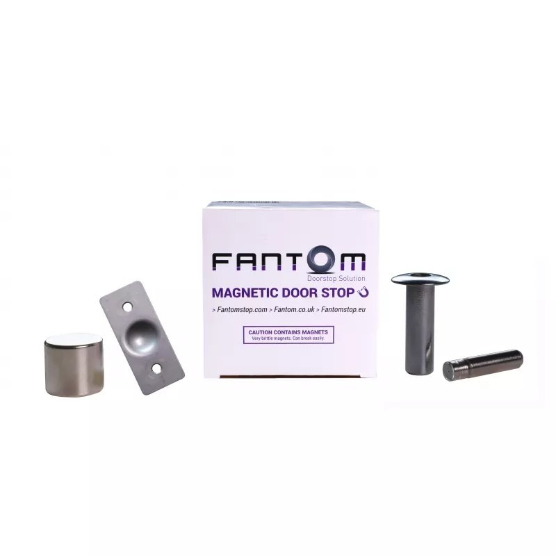 Стопор состоит из редкоземельного неодимового магнита, втулки из полимера или металла, металлического штифта с полимерным наконечником и пластины, которая фиксирует магнит в дверном полотне.