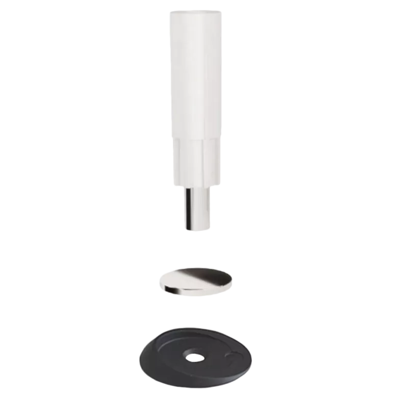 Комплектация стопора содержит монтажную панель с невидимым магнитом и фиксатор в полимерном корпусе с металлическим штифтом. Фиксатор врезается в торец дверного полотна, а монтажная панель с магнитом крепится на пол с помощью скотча ЗМ для особенно крепкой фиксации.